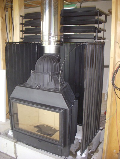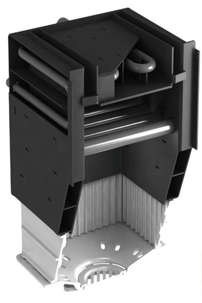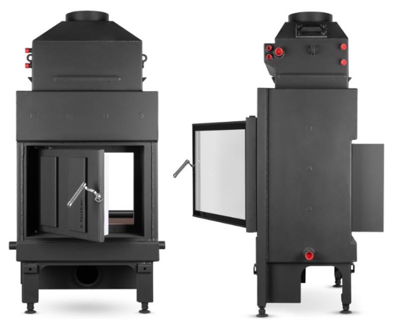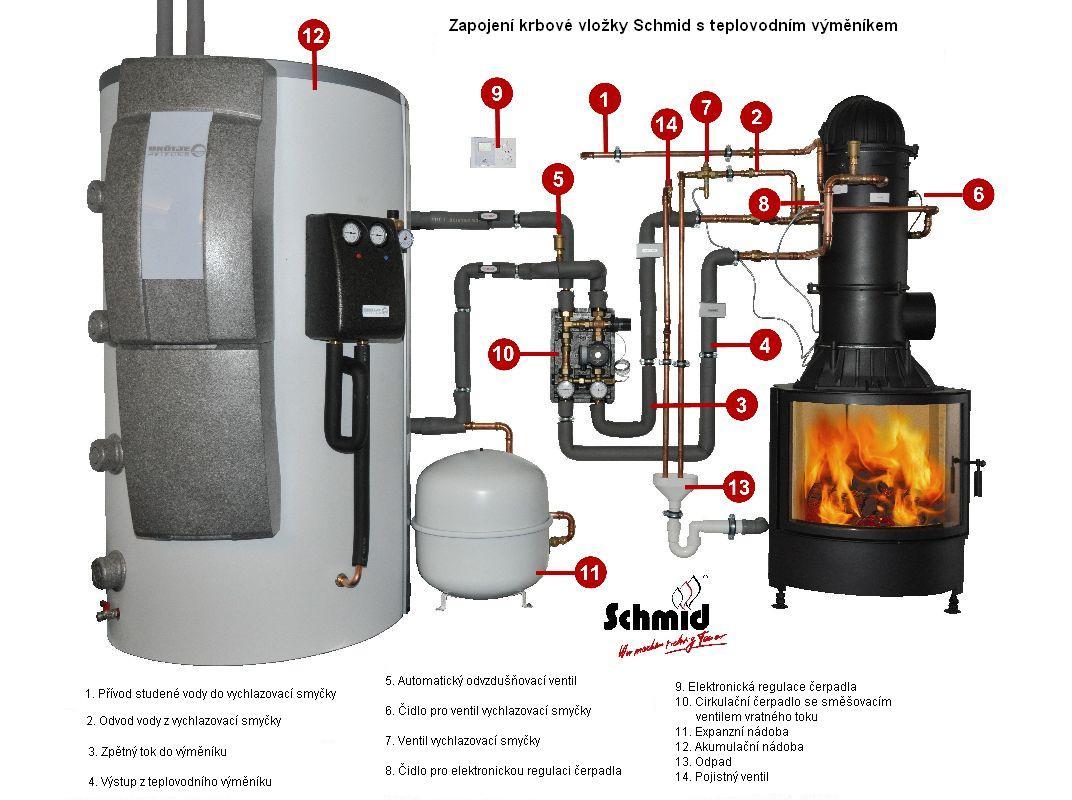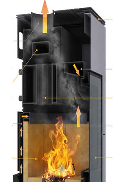 Výměníky ve spalinové cestě – nad topeništěm. Spaliny, které odcházejí z topeniště mají vysokou teplotu, čehož využíváme pro ohřev vody ve vrchní části krbové vložky.